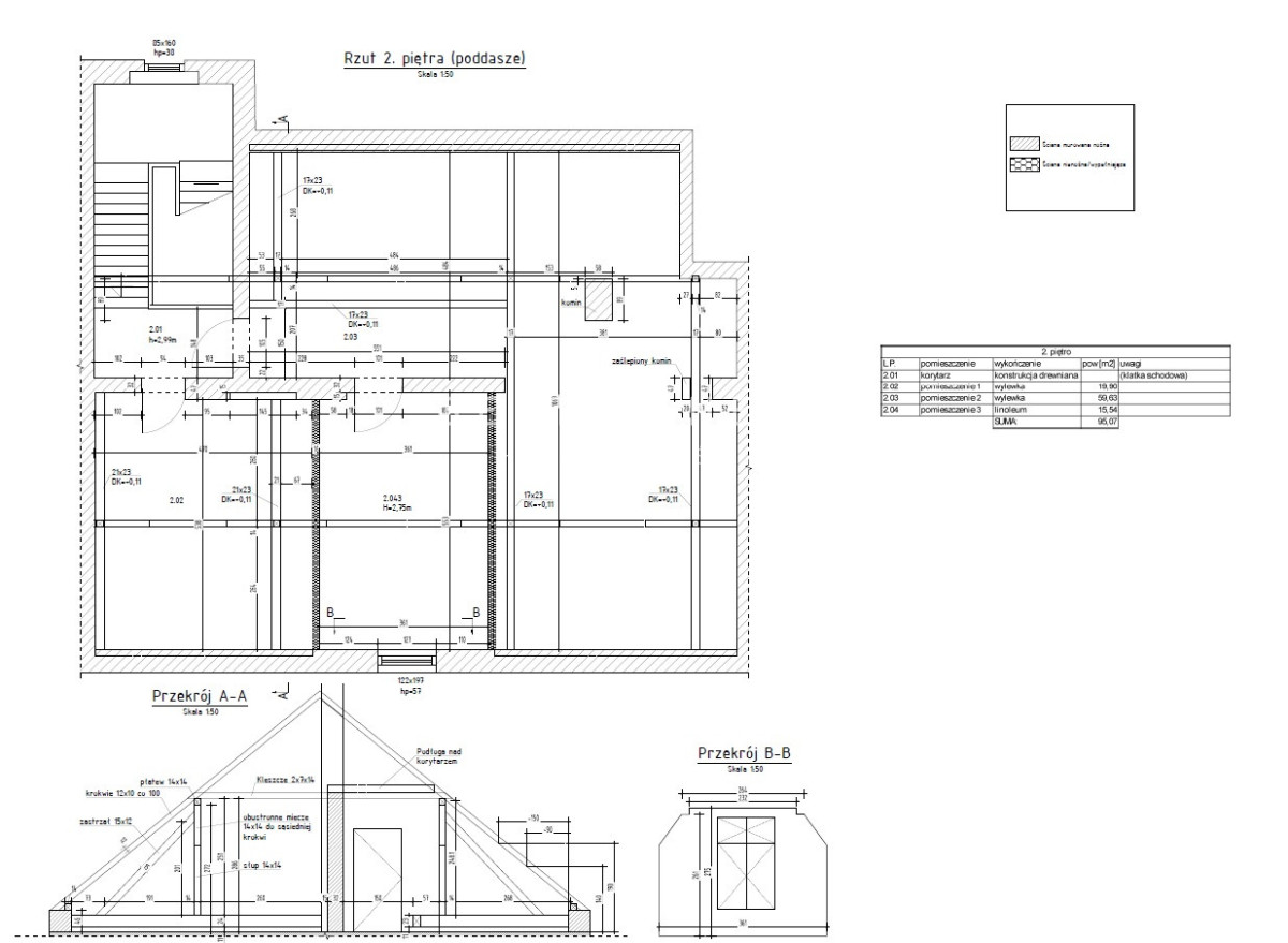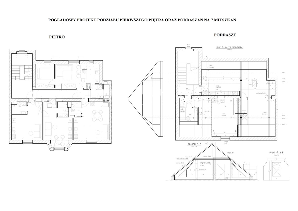 - Ostatnie zdjęcie prezentuje potencjalne możliwości przebudowy piętra i poddasze na 7 mieszkań