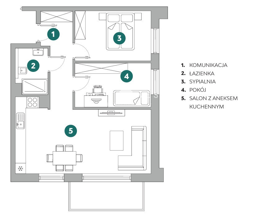 - Komunikacja - funkcjonalny przedpokój łączący wszystkie pomieszczenia.