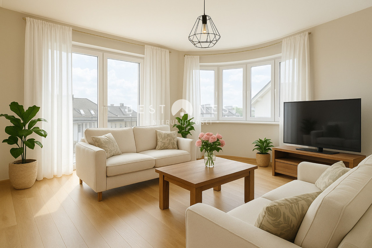 • Salon z dużymi oknami i wyjściem na słoneczny balkon