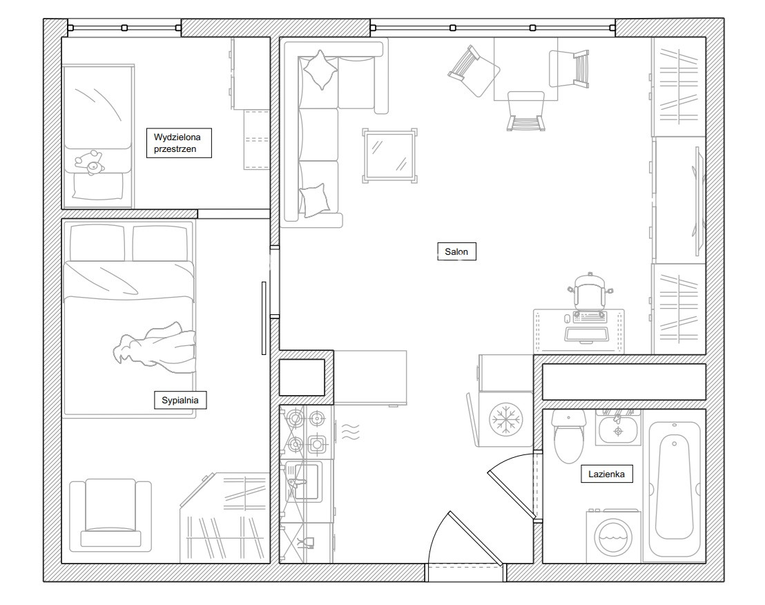 - Funkcjonalny układ pomieszczeń - przemyślane rozmieszczenie stref dziennych i prywatnych sprawia, że lokal wydaje się większy niż wskazuje metraż,
