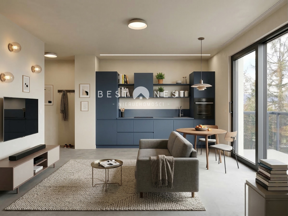 - Część dzienna (20,07 m²): Przeszklony salon z aneksem, skierowany na zachód - idealne miejsce na relaks przy zachodzącym słońcu.