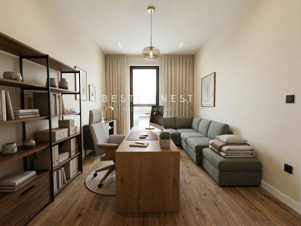 - Pokój (9,56 m²): Doskonały jako gabinet lub pokój dziecięcy.