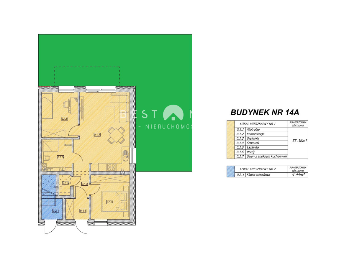 Apartament na parterze składa się z salonu z aneksem kuchennym, 2 pokoi, łazienki, komunikacji oraz wiatrołapu o powierzchni użytkowej 55,36m2 oraz ogrodu o powierzchni ok 150m2.