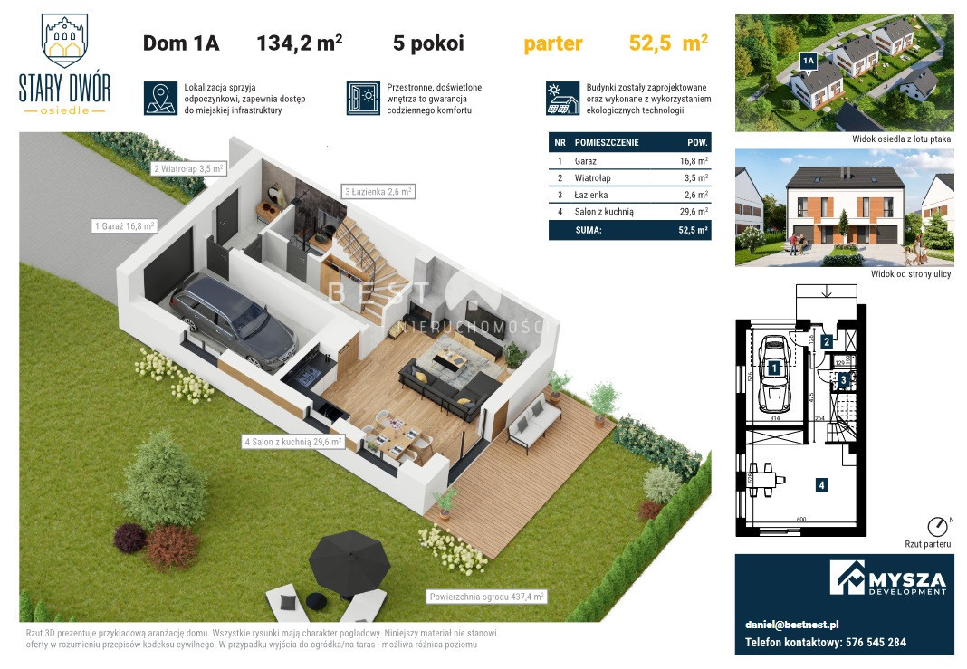 Na sprzedaż nowy segment 1A o powierzchni całkowitej 134m2 w kameralnej inwestycji obejmującej tylko 3 budynki jednorodzinne w zabudowie bliźniaczej, położony w spokojnej, zielonej okolicy z dala od miejskiego zgiełku, a jednocześnie doskonale skomunikowany - zaledwie 15 minut od centrum Bielska-Białej i 8 minut od Żywca. Trasa S1 znajduje się w odległości niespełna 4 km.